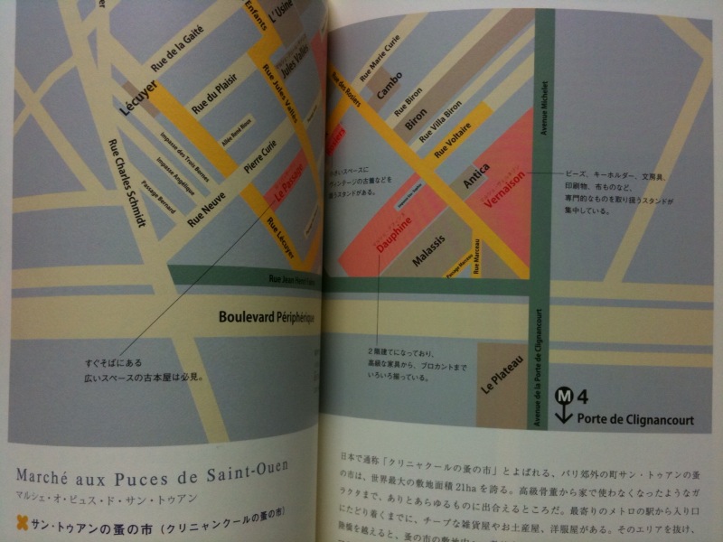 写真は、著者のフランスのアンティークへの興味が始まった(著者の感性に火をつけた?)キュイズィノフィリというアンティーク店の店内の様子と、 サン・トゥアンの蚤の市のガイド地図です。具体的な写真や地図で細かく紹介されているので、フランスアンティークに興味のある方にはいい本ではないでしょうか?